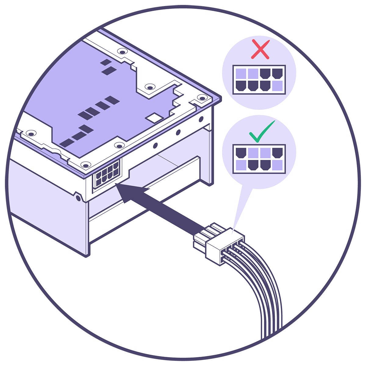 Connect an 4+4-pin EPS12V power cable to the 8-pin plug. (NOTE: Do not connect a 6+2-pin PCIe power cable to the 8-pin port on the card.)