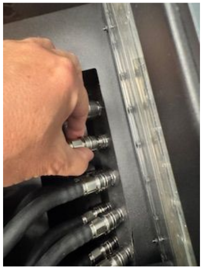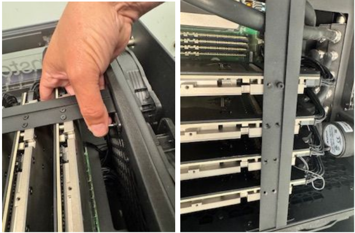 Pull the quick-disconnect shield back and gently pull the hoses to detach the cooling tubes from the cards.