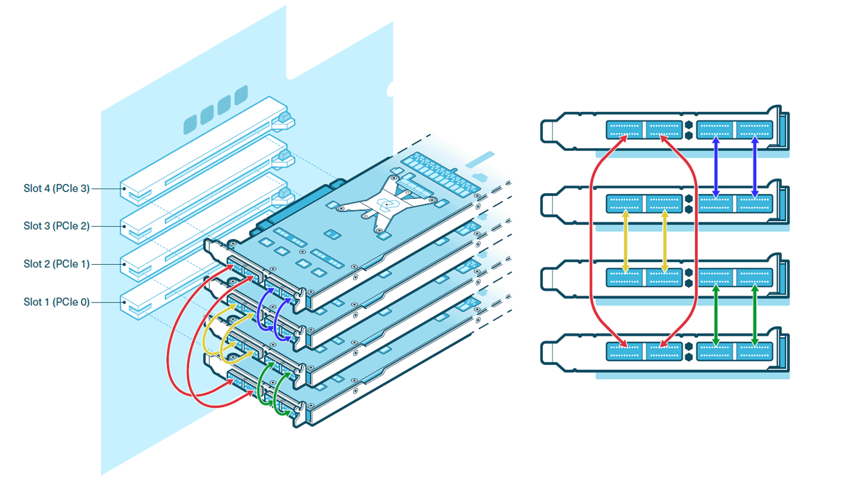 Connect QSFP-DD cables. The included Quad Small Form-factor Pluggable Double Density (QSFP-DD) cables enable high-speed interconnectivity between the Tenstorrent Tensix cores. Your system includes four Blackhole™ processors and eight external QSFP-DD cables to create the processor mesh. Connect the eight cables according to the system topology diagram below. Ensure each cable is aligned correctly and clicks into place; do not force the connections.