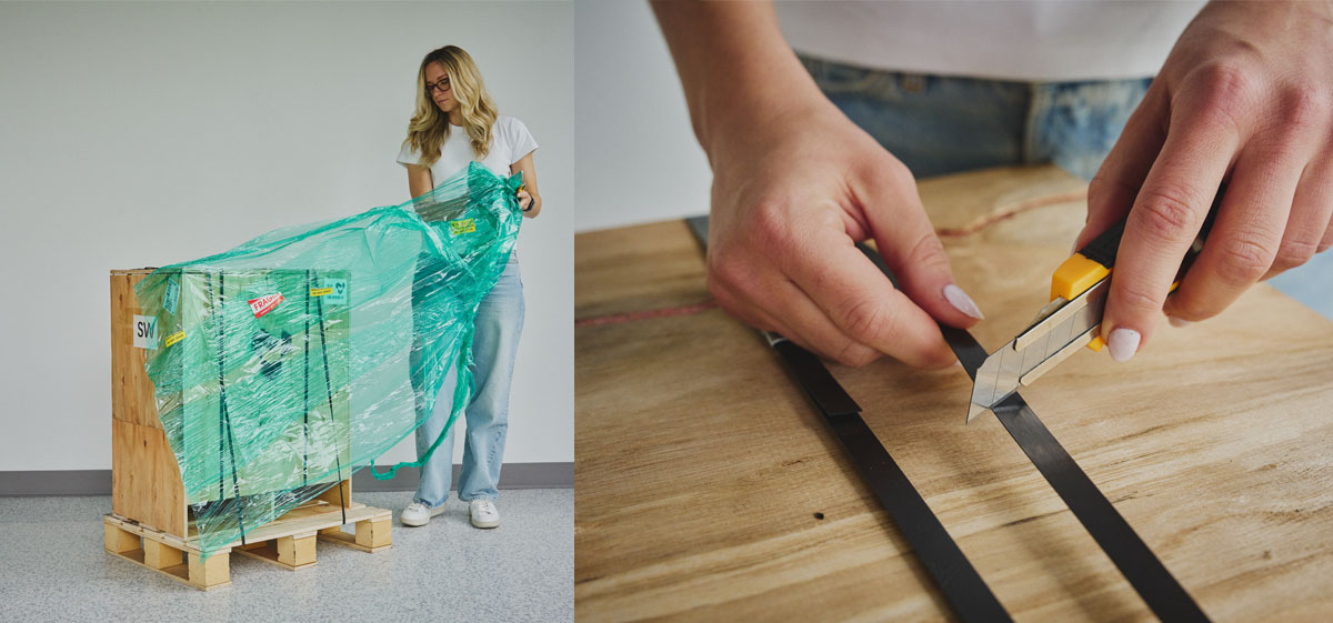 Open the cardboard box. Cut the two lifting straps off the cardboard box and open the top flaps.