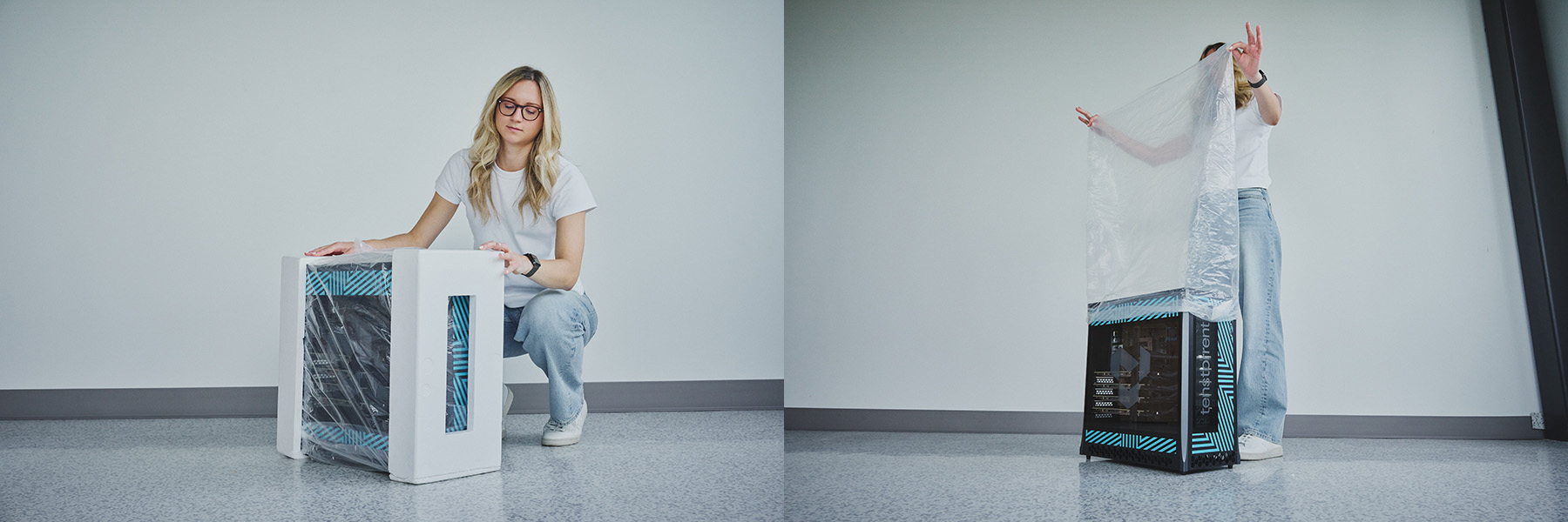 Remove the workstation from the cardboard box. Reach into the short sides of the box, secure your hands under the supportive styrofoam, and lift the TT-QuietBox Blackhole™ workstation out of the box. Place it in your workspace.