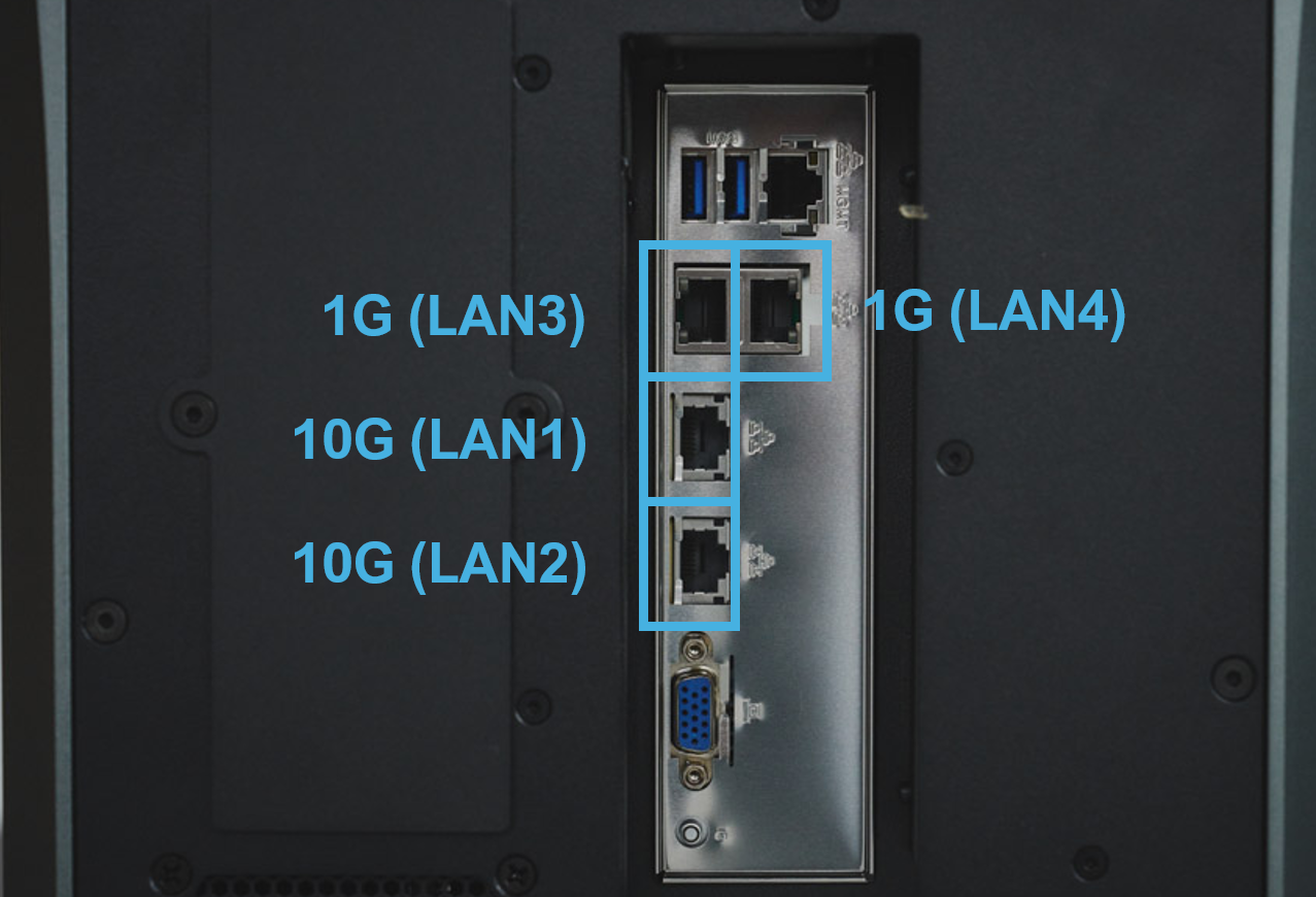 Connect to the network. For host system network access, connect a standard Ethernet cable (Cat 6 or better, user-provided) to an RJ45 LAN port on the rear panel. The LAN1 and LAN2 ports are 10GbE, while LAN3 and LAN4are 1GbE.