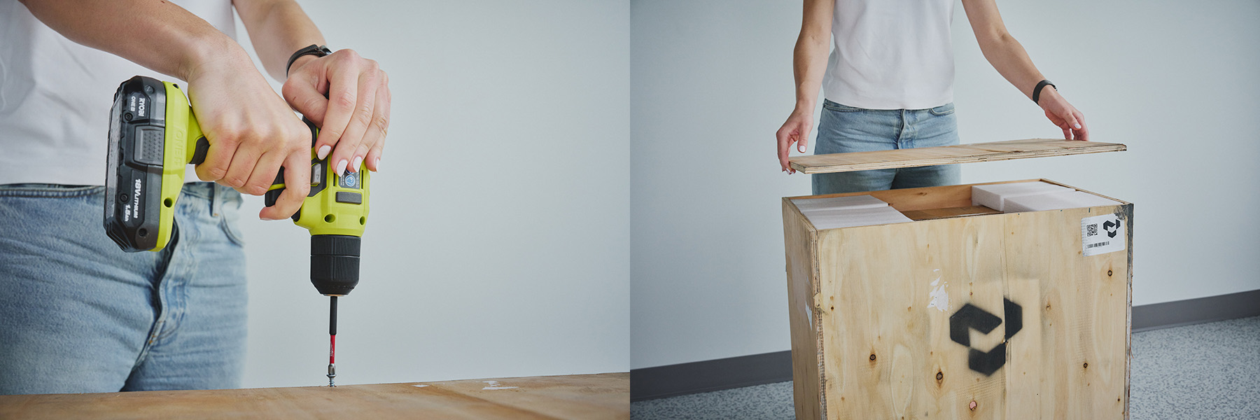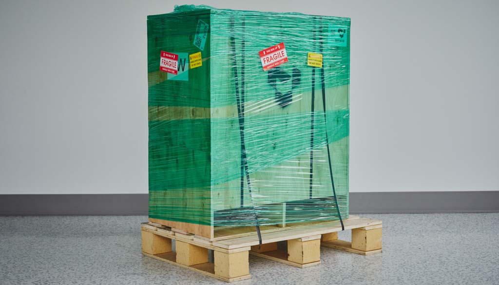 Remove plastic wrap. Remove the outer plastic wrap and cut the two lifting straps looped around the crate.