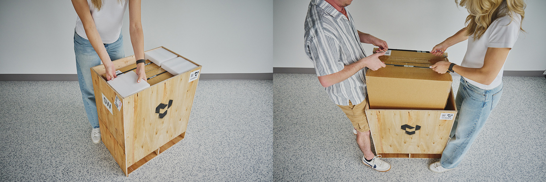 Position the crate. Position the crate in your prepared unboxing area, ensuring ample space for two people to work around it.