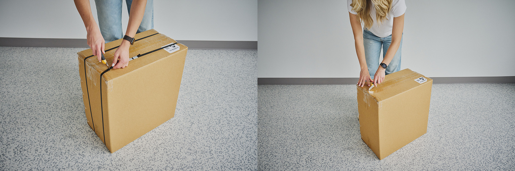 Open the cardboard box. Cut the two lifting straps off the cardboard box and open the top flaps.