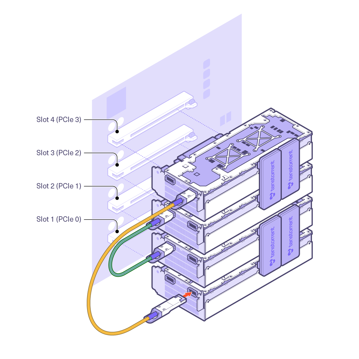 Connect QSFP-DD cables. The included Quad Small Form-factor Pluggable Double Density (QSFP-DD) cables and internal Warp 100 bridges enable high-speed interconnectivity between the Tenstorrent Tensix cores. Your system includes four Wormhole™ n300 Accelerators, internal Warp 100 bridges and two external QSFP-DD cables to create the processor mesh.