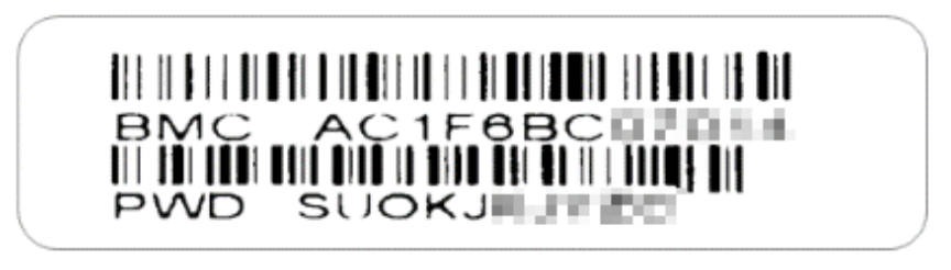 The MAC address and password for the BMC (baseboard management controller) can be found on labels on both the system chassis and the motherboard. A small slide-out tray with the label is hidden behind the front cover, at the bottom of the system. The label will look like this: