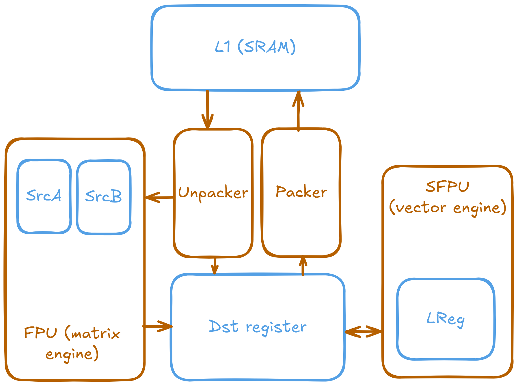 SrcA,SrcB, orDstregisters.Packer: Takes results from the compute engines (from the