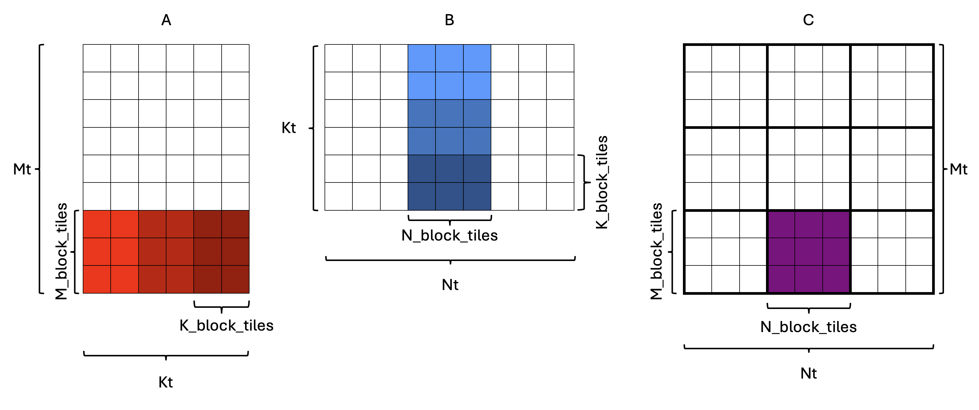 A_slab(b)andB_slab(b)) from the circular buffers in the same order that the compute kernel will use them. Order tiles within each slab in the CB in row-major order. The writer kernel should read theC_blocktiles from the output circular buffer in row-major order and write them to the output tensor in appropriate locations.-