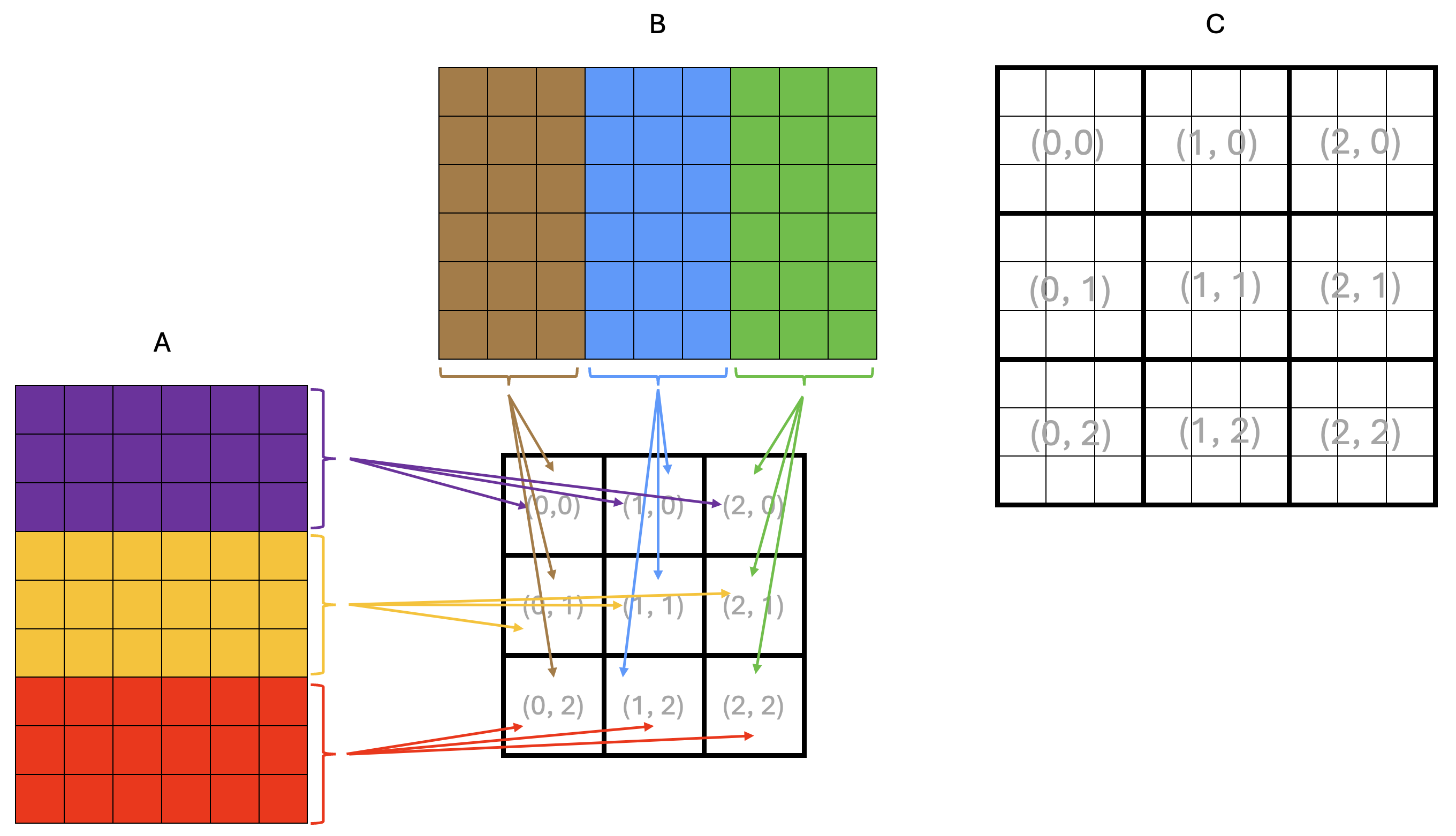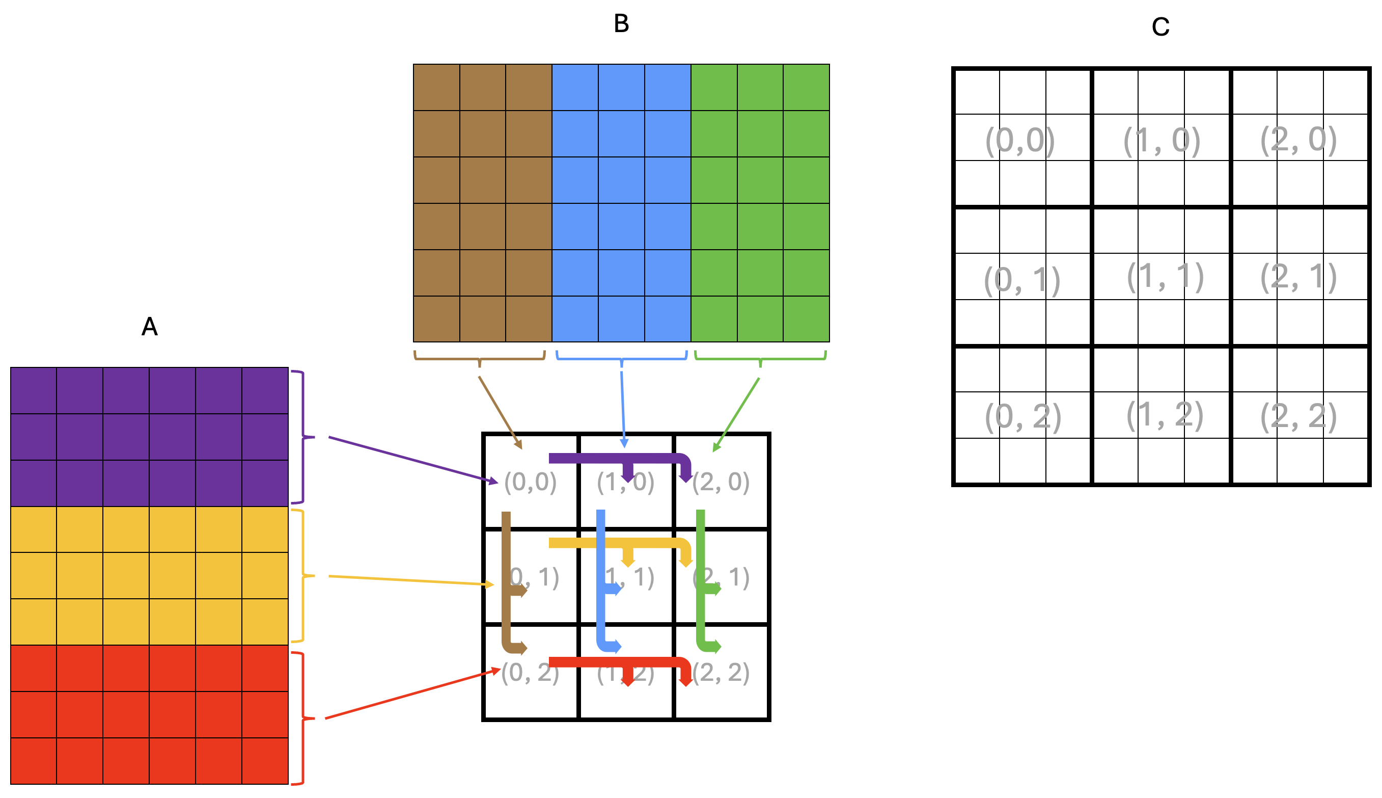 matrix C to indicate the core that computes the corresponding rectangular block of tiles.