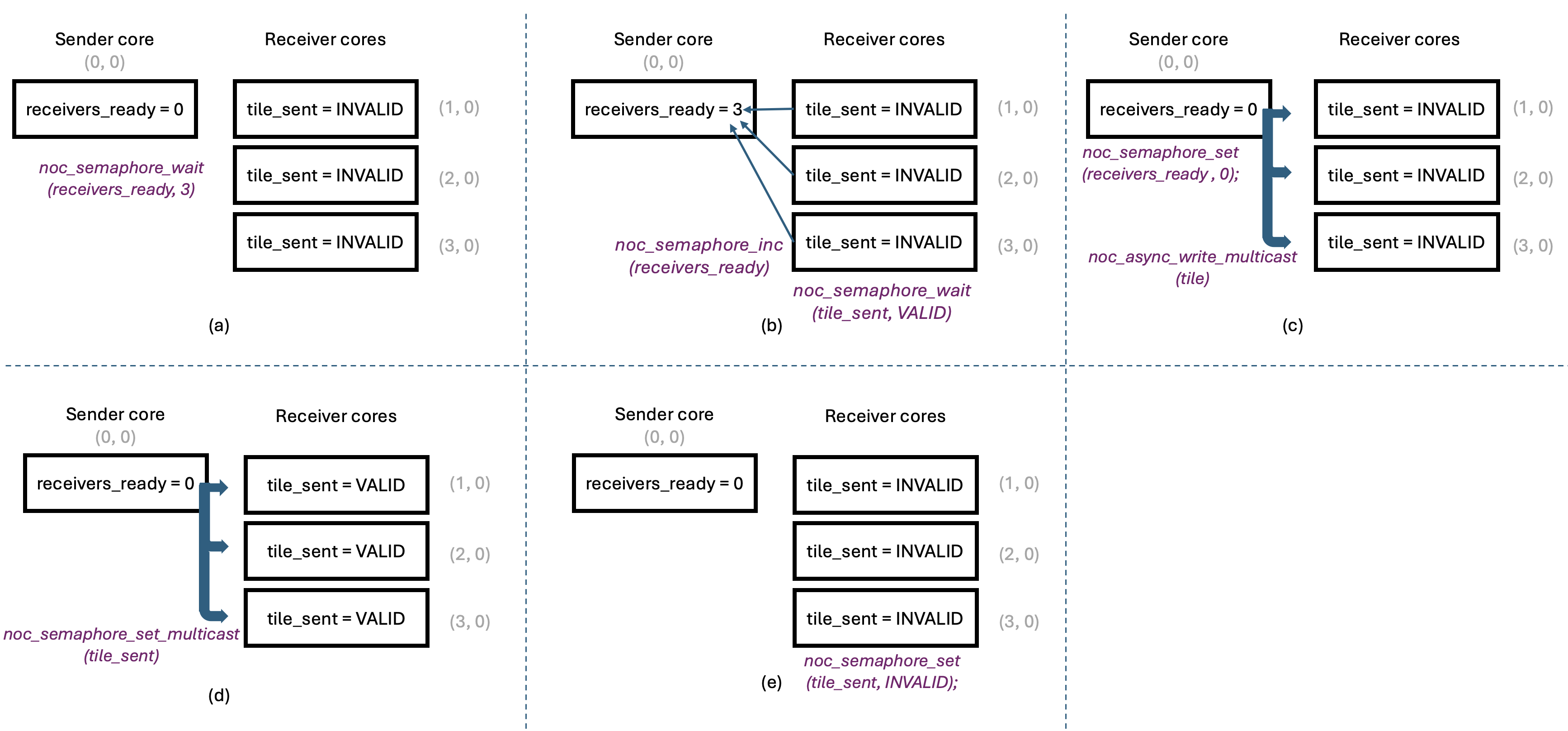 Given that multicast uses a “push” model in which the sender writes data directly into the receivers’ on-chip SRAM, it is important to coordinate execution between the sender and receivers to avoid data corruption and race conditions. This coordination is done using semaphores. In general, a semaphore is a small shared variable used to coordinate concurrently running code. For example, one semaphore can signal that receivers are ready for data (for example, after reserving a CB slot for an incoming tile), and another can signal that data has been sent (i.e., written to receivers’ memory).