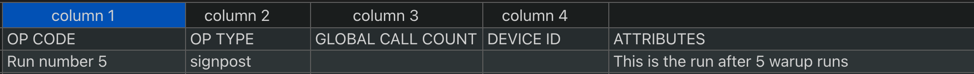 signpost(header="Run number 5", message="This is the run after 5 warmup runs")